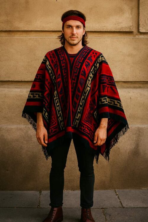 The poncho is central to Chile’s sartorial heritage, with variations by region. The Mapuche poncho (makun) is handwoven from thick wool, often striped in bold horizontal or vertical patterns, serving both practical and symbolic functions. It represents protection and identity, worn daily and ceremonially by Mapuche men. The Chilote poncho, by contrast, is heavier and coarser, knit or woven from sheep’s wool in the stormy Chiloé region. Typically grey or earth-toned, it shields wearers from rain and wind. Both versions reveal adaptation—one spiritual, one environmental—yet equally iconic.
