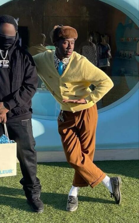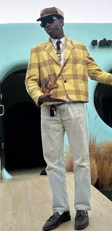 Of Nigerian and African-American descent, Tyler’s cultural background subtly enriches his aesthetic, blending vibrant tones, heritage pride, and a playful disregard for rules. His early fashion days were marked by Supreme caps, skate tees, and Vans sneakers—clothing that reflected a laid-back West Coast energy. But as he evolved musically—from Goblin to Flower Boy and Call Me If You Get Lost—so did his wardrobe. Out went the skater kid; in came a dandyish style savant with a suitcase full of pastel suits, fluffy hats, and brooches that could make a Paris runway blush.